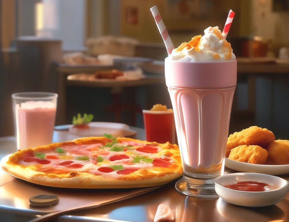 Мини-пицца с ветчиной, наггетсы 6 шт, кетчуп, молочный коктейль с сиропом
