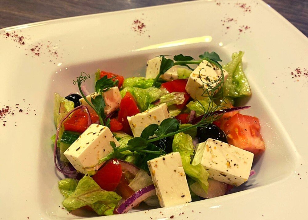 Салат айсберг, перец болгарский свежий, огурец свежий, маслины, красный репчатый лук, сыр фета, масло оливковое, сок лимона, бальзамический уксус, специи. Вес 280 г