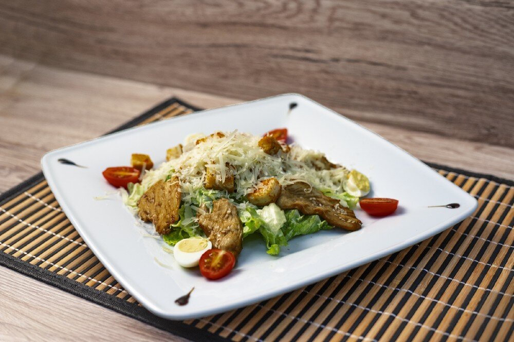 Обжаренное филе куриной грудки, салат айсберг, томаты черри, перепелиное яйцо, сыр пармезан, гренки, фирменная заправка, специи. Вес 230 г