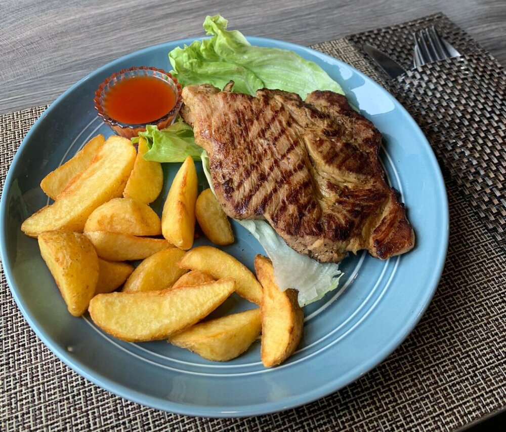Свиная шея в медово-горчичном соусе, обжаренная на гриле, картофельные дольки, кисло-сладкий соус. Выход: 300 г