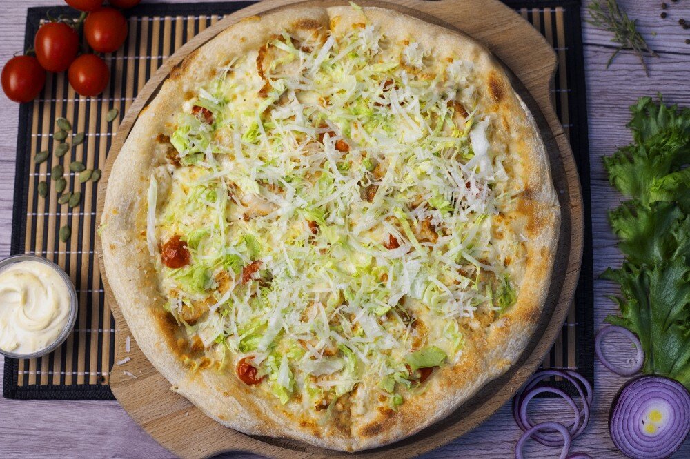 Нежнейшее сочетание соуса "Цезарь", куриного филе, томатов черри, сыров моцарелла и пармезан, зелени. Диаметр 33 см. Вес 630 г