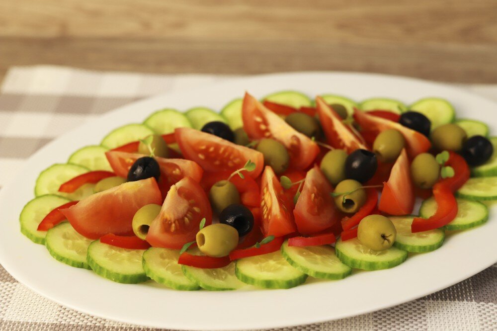 Свежие томаты, огурцы и болгарский перец. Блюдо украшается оливками и зеленью. Выход 300 г