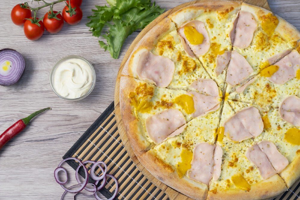 Соус белый чесночный, ветчина в/к, сыр моцарелла, сыр чеддер, специи. Диаметр 33 см. Вес 590 г