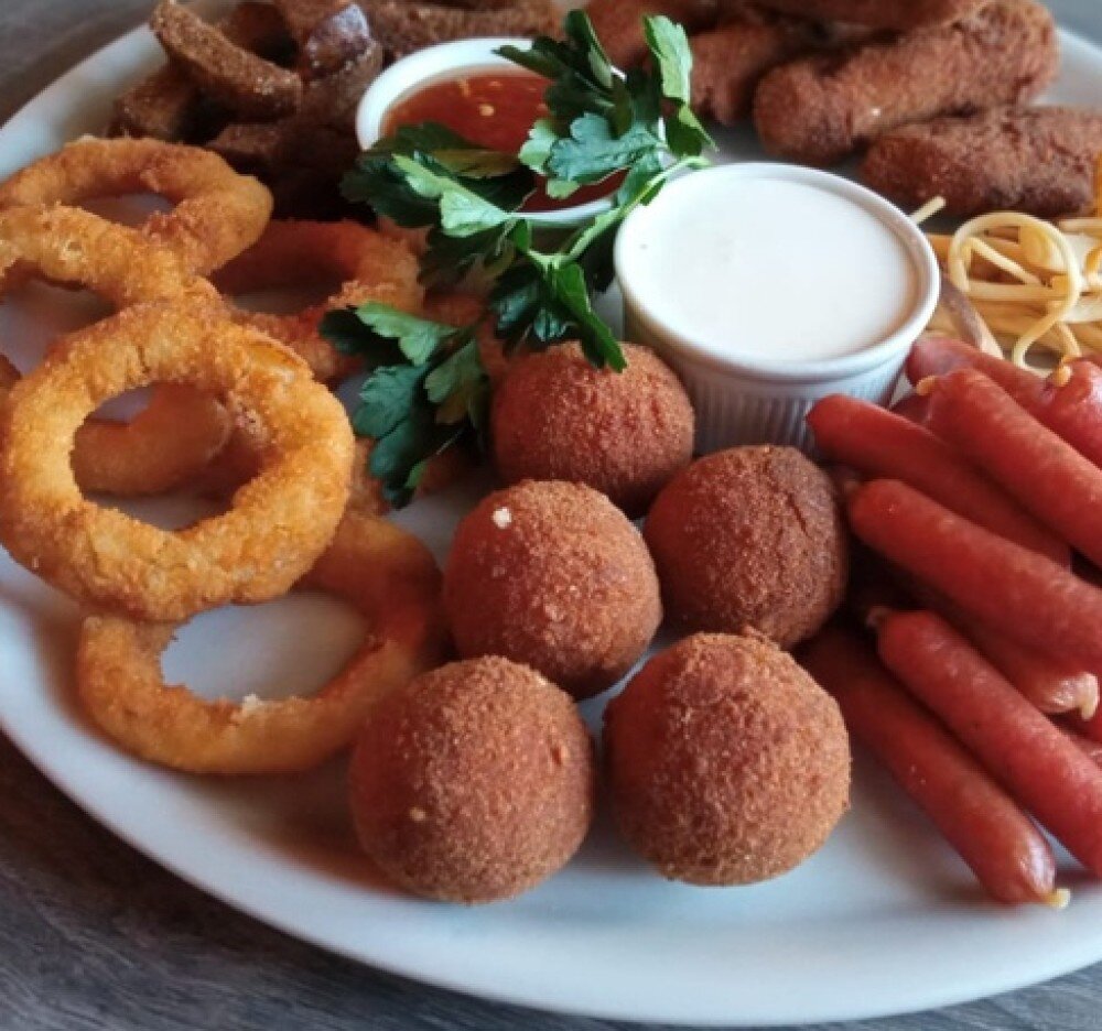 Сырные шарики или палочки в панировке, куриные крылышки, луковые кольца, гренки с чесноком, сыр чечил, колбаски с/к к пиву, соус чесночный, соус чили. Выход блюда 599/50/50