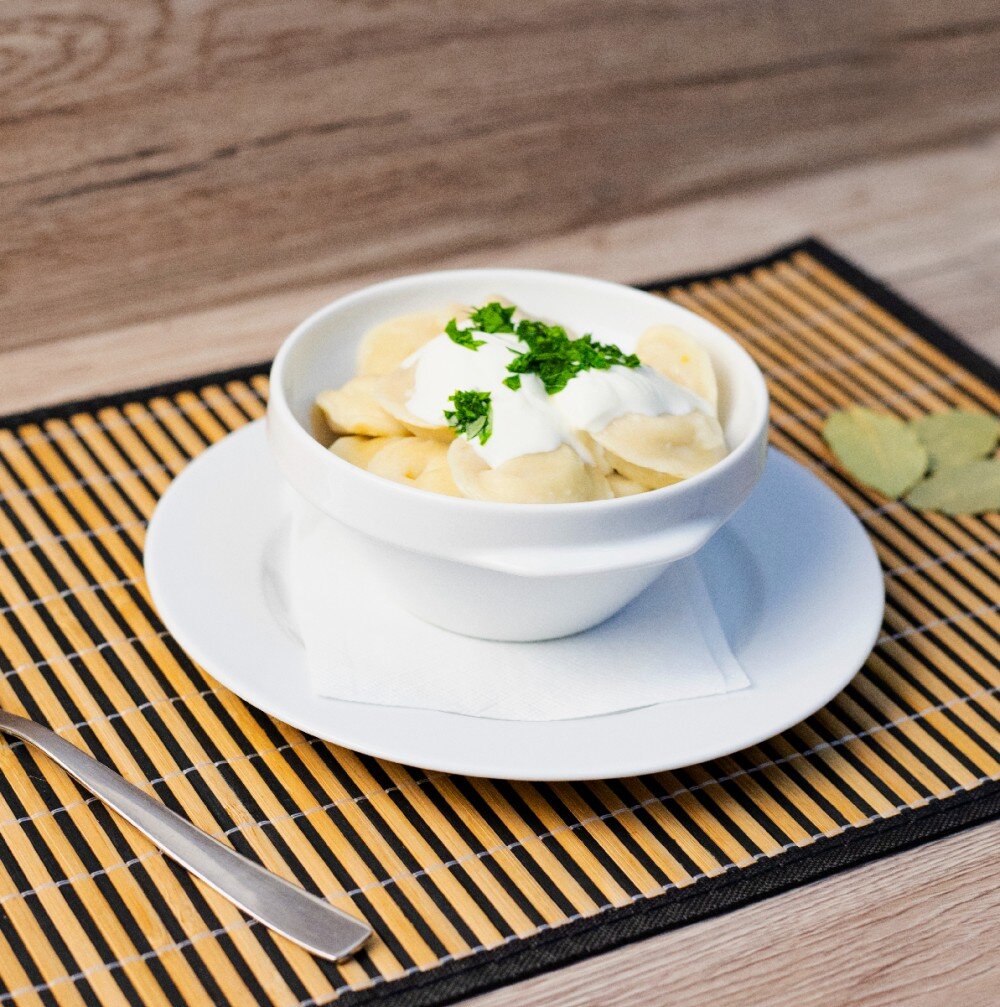 Пельмени собственного производства.Свинина/говядина лук репчатый,специи, мука, яйцо. Подаются со сметаной и зеленью. Выход 270/30