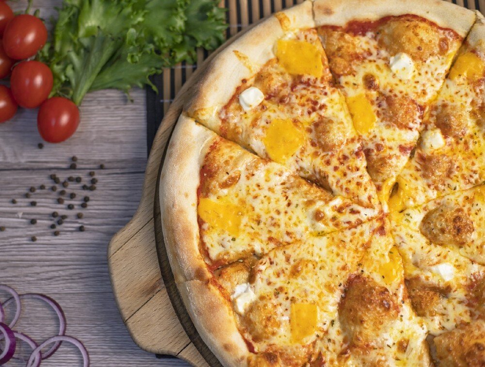 Соус томатный, сыр фета, сыр чеддер, сыр моцарелла, сыр пармезан, специи. Диаметр 33 см. Вес 580 г