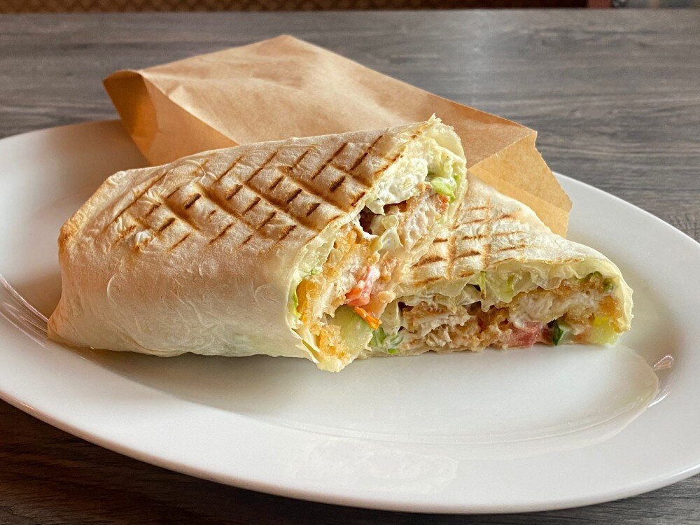 Лаваш, стрипсы из курицы, свежие огурцы и помидоры, салат айсберг, соус белый. Вес 300 г