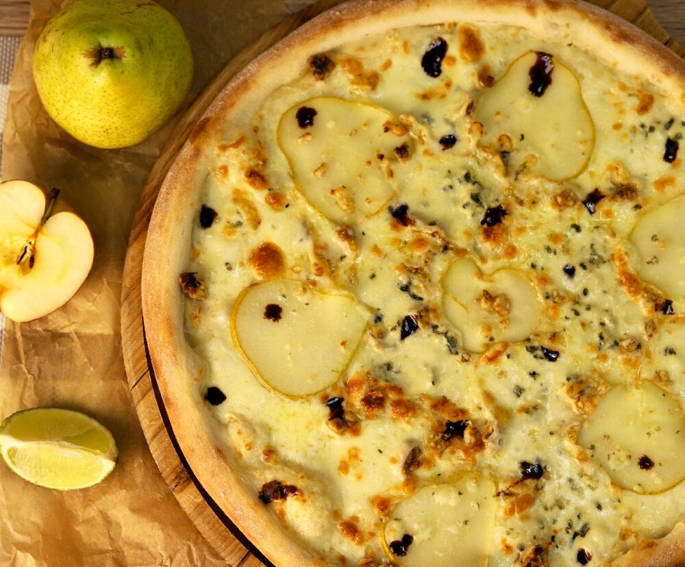 Сливочный соус, груша, сыр дор блю, сыр моцарелла, грецкий орех, крем-соус бальзамический. Диаметр 30 см. Вес 500 г