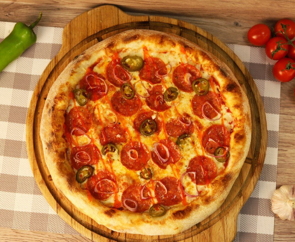 Соус томатный, колбаса "Пепперони" с/к, лук репчатый красный, перец халапеньо, сыр моцарелла, соус чили, специи. Острая. Диаметр 25 см. Вес 340 г