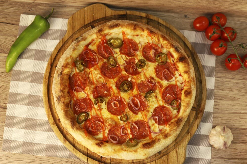 Соус томатный, колбаса "Пепперони" с/к, лук репчатый красный, перец халапеньо, сыр моцарелла, соус чили, специи. Острая. Диаметр 50 см