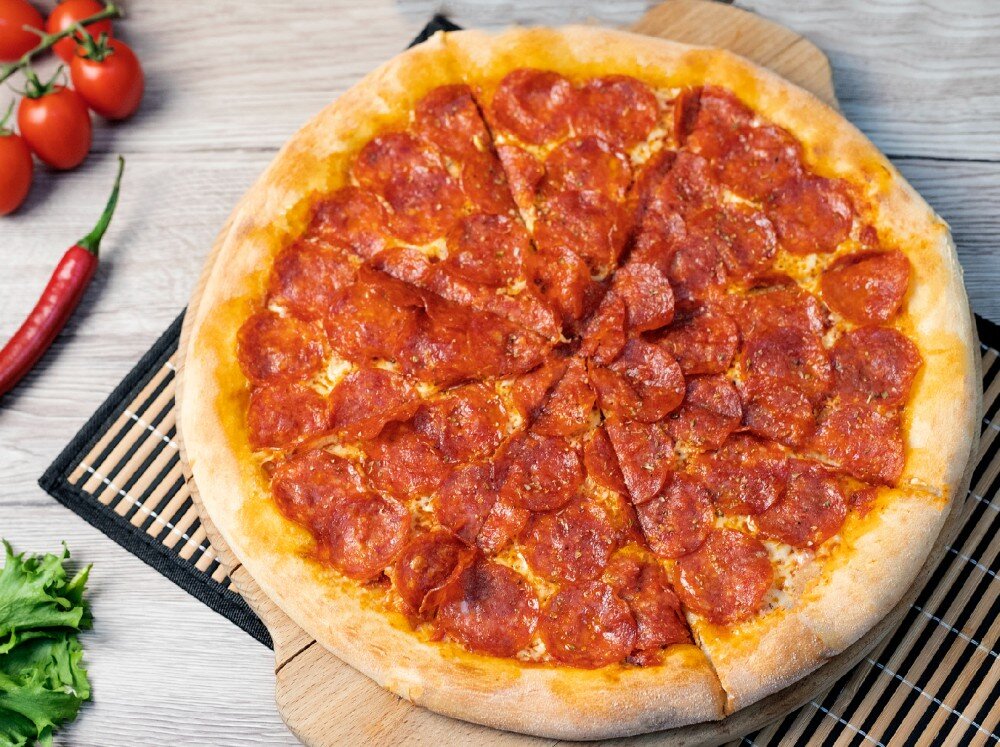 Соус томатный, колбаса "Пепперони" с/к, сыр моцарелла. Диаметр 33 см. Вес 600 г