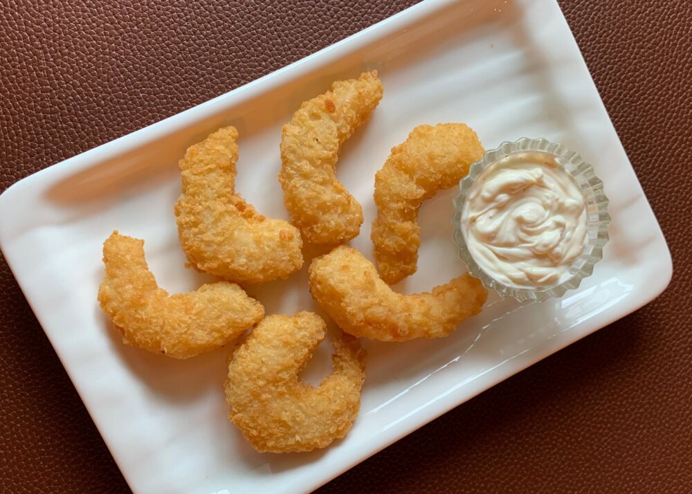 Креветки в панировке, обжаренные во фритюре. Подаются со сливочно-чесночным соусом.