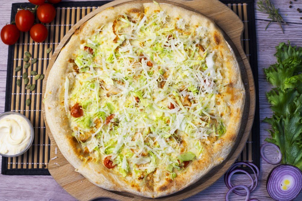 Соус "Цезарь", куриное филе, томаты черри, сыр моцарелла, сыр пармезан, салат айсберг. Диаметр 50 см.