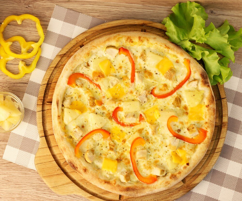 Соус чесночный, филе грудки, перец болгарский, ананас консервированный, сыр моцарелла, сыр чеддер, специи. Диаметр 33 см. Вес 740 г