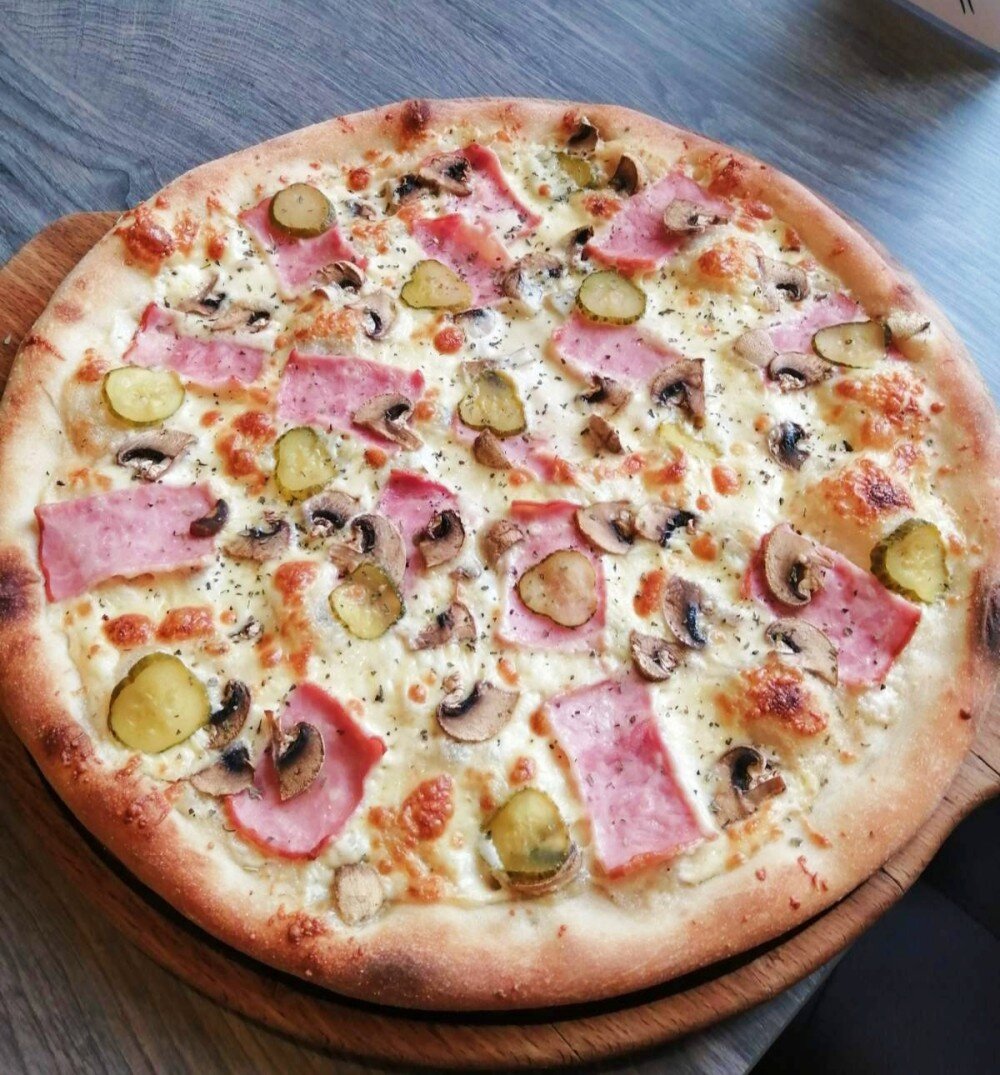 Пицца с ветчиной, шампиньонами и маринованными огурчиками 50 см/1590 г