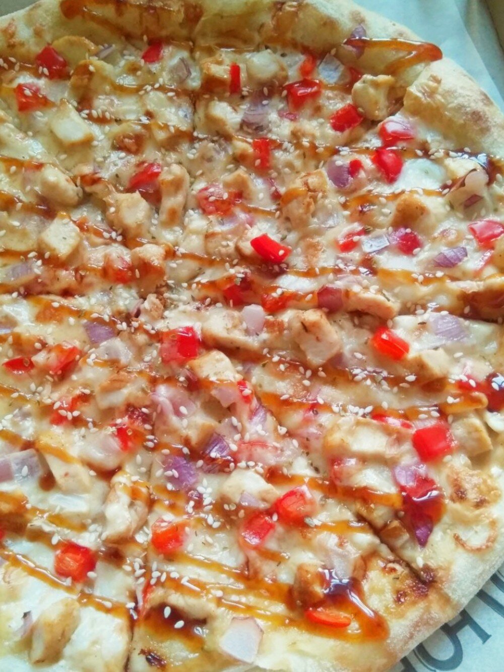 Соус белый чесночный, соус терияки, филе куриной грудки, красный репчатый лук, перец болгарский, сыр моцарелла, кунжут. Диаметр 30 см.