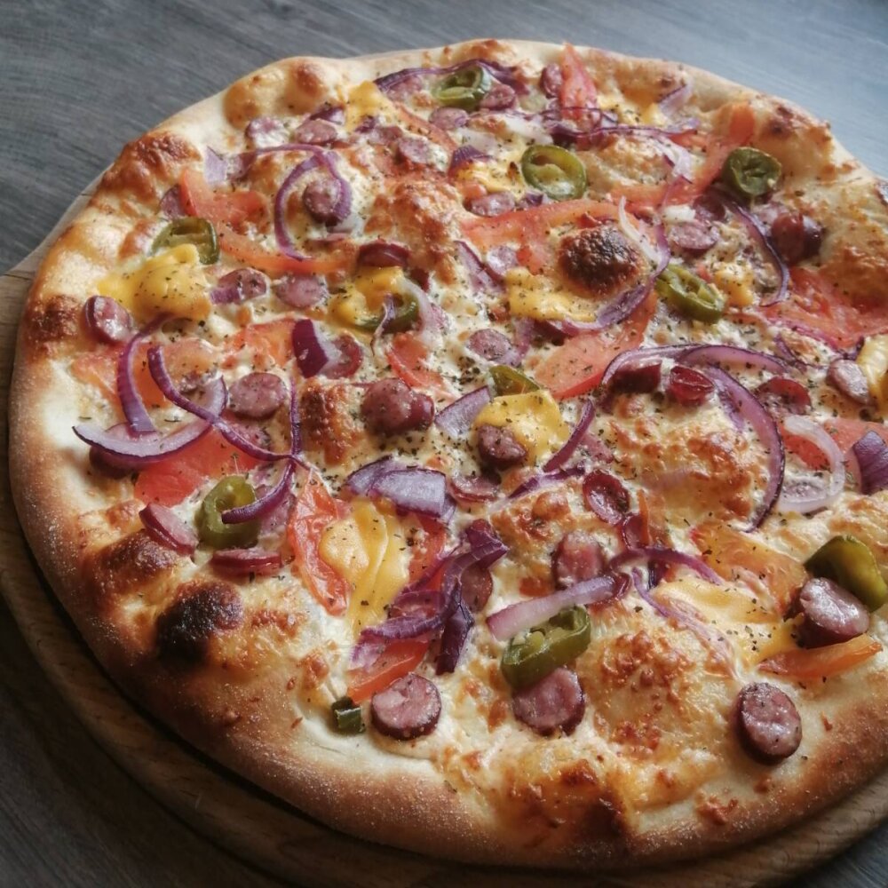 Соус белый чесночный, колбаски охотничьи п/к, шампиньоны, лук красный репч., томаты свеж., перец халапеньо, сыр моцарелла, сыр чеддер, специи. Диаметр 33 см. Вес 690 г