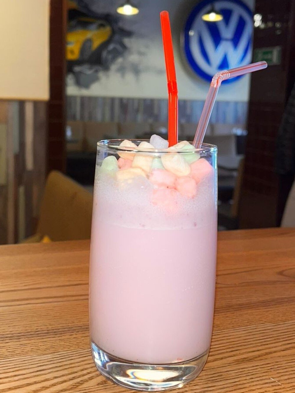 Молоко, пломбир, клубника, сироп, маршмеллоу.