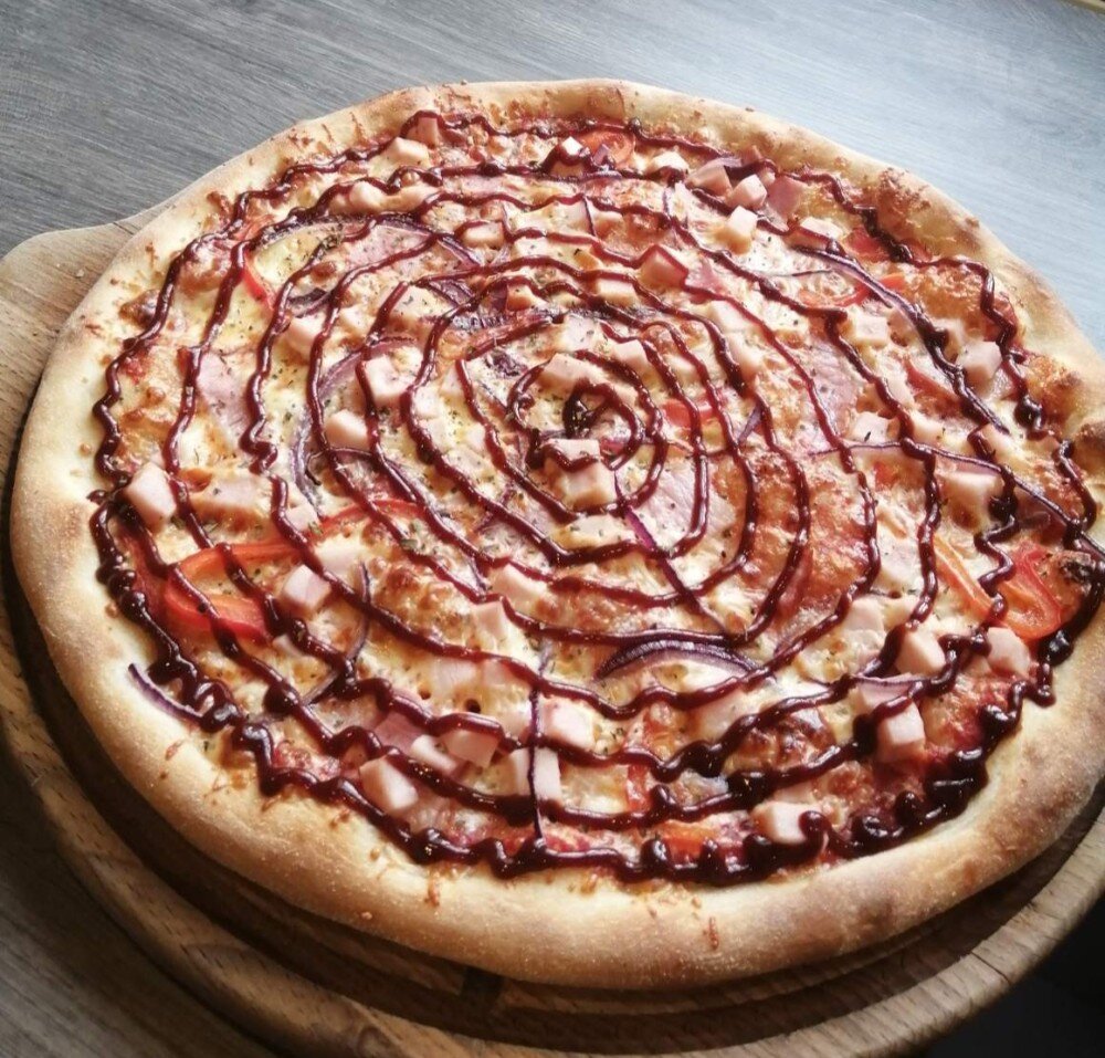 Соус томатный, бекон в/к, лопатка в/к, перец болгарский, лук красный репчатый, сыр моцарелла, соус барбекю, специи. Диаметр 50 см