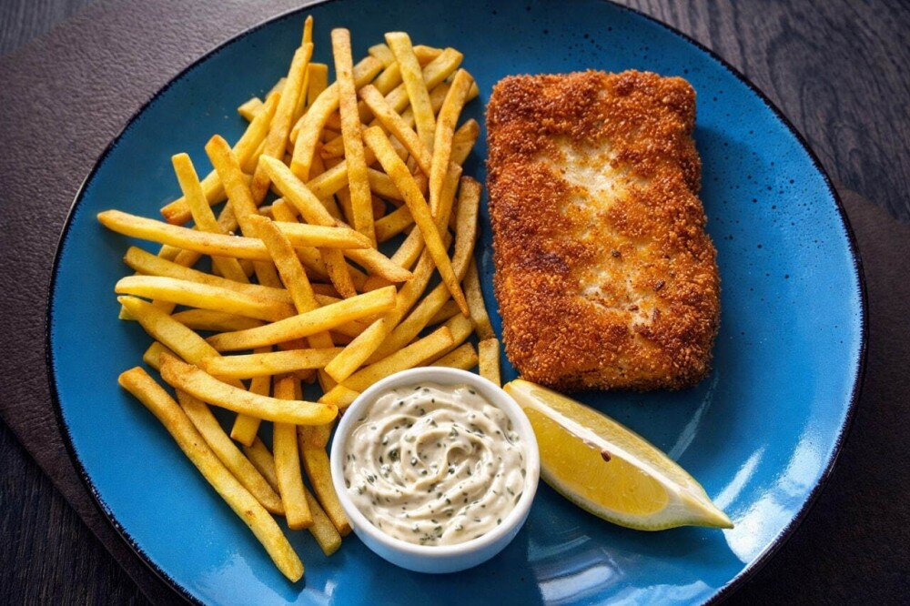 Филе рыбы тресковых пород, картофель фри, соус тар-тар, лимон.Вес: 320/50 г