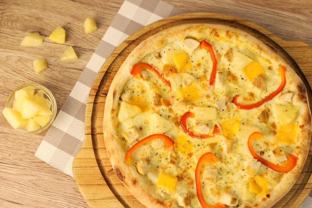 Соус чесночный, филе грудки, перец болгарский, ананас консервированный, сыр моцарелла, сыр чеддер, специи. Диаметр 50 см