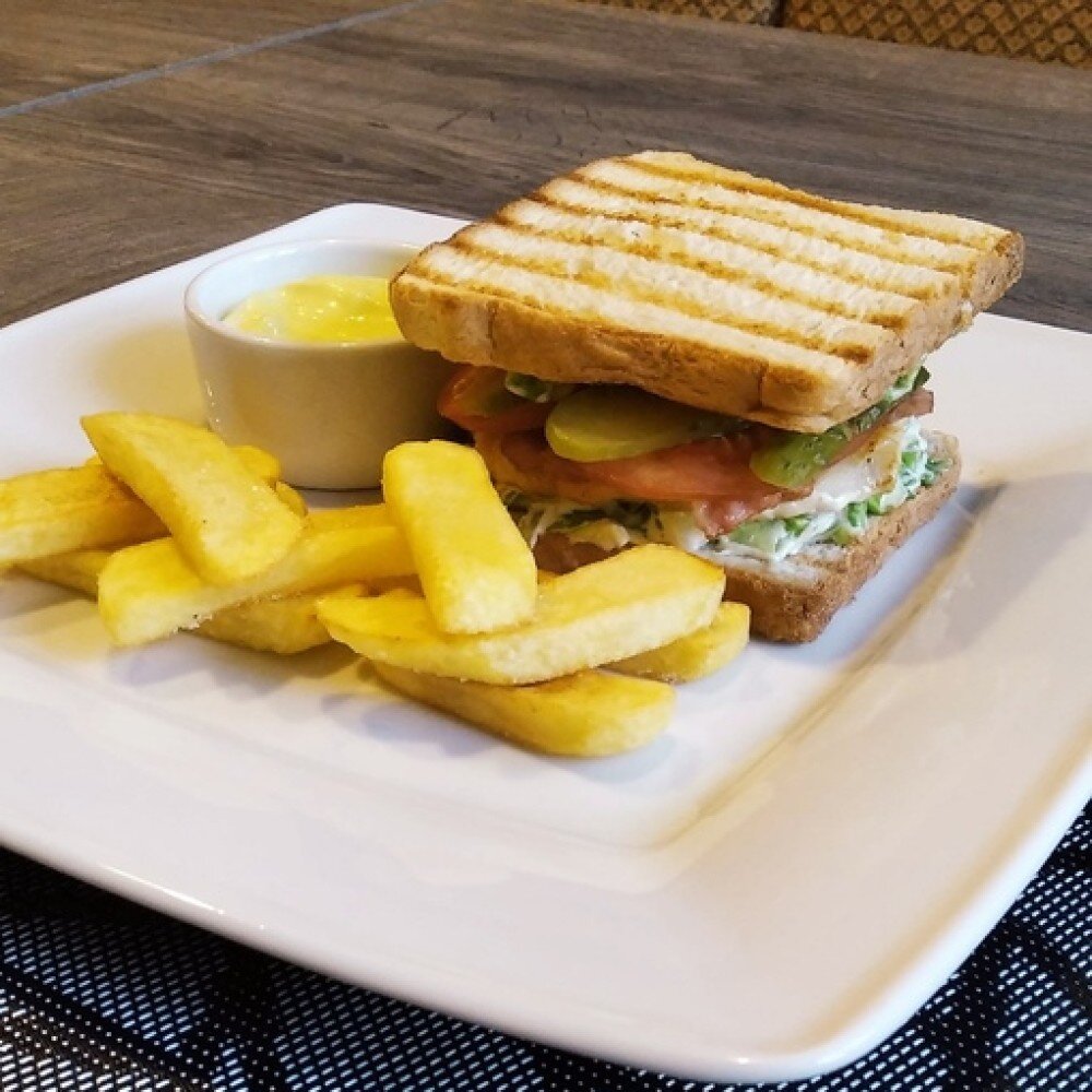 Обжаренные ломтики хлеба, филе куриной грудки, бекон в/к, салат айсберг, свежие томаты, маринованные корнишоны, майонез, специи. Подается с картофелем фри и соусом для бургеров. Внешний вид картофеля фри может отличаться от фото. Вес 250/90/50
