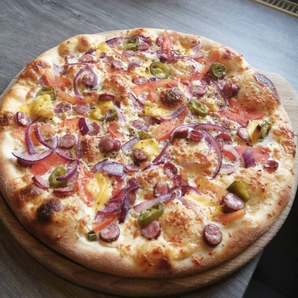 Соус белый чесночный, колбаски охотничьи п/к, шампиньоны, лук красный репч., томаты свеж., перец халапеньо, сыр моцарелла, сыр чеддер, специи. Диаметр 50 см