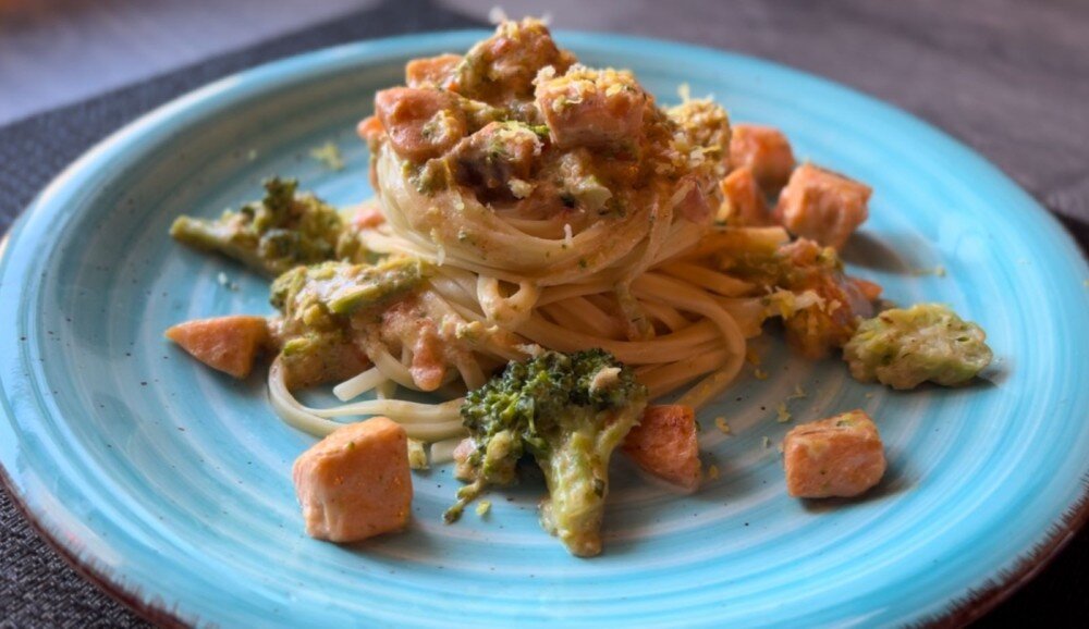 Тальятелле, лосось, томаты, брокколи, сливки, специи. Выход: 300 г